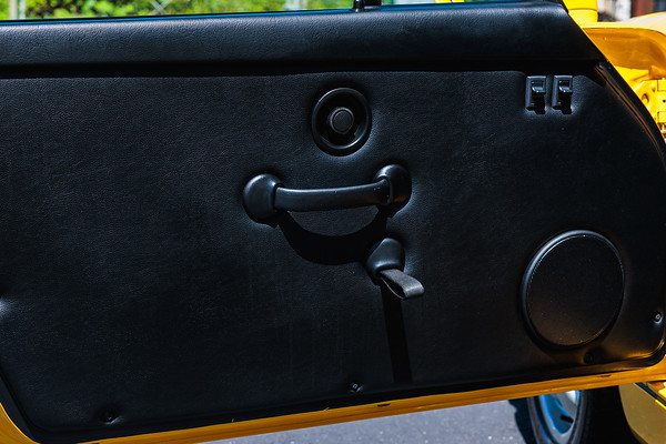 All interiors were black with black cord fabric covered sports seats as standard. It was possible to order the seatbelts and door pull-straps in either Black, Red or Blue. The interior door panels comply with the weight saving theme in that they were devoid of the armrest and door pockets that were standard on the regular 964. Instead of a complex opening mechanism the RS America simply had a webbing strap in a loop that you pull to open the door. In order to meet type US certification requirements, the RS America came with electric windows